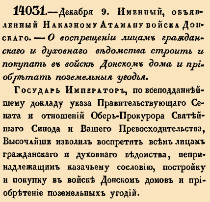 14031. — 21 декабря (9 декабря по ст.ст.). Именный, объявленный Наказному атаману войска Донского, 1840 год.О воспрещении лицам гражданского и духовного ведомства строить и покупать в войске Донском дома и приобретать поземельные угодья.Государь Император, по всеподаннейшему докладу указа Правительствующего Сената и отношений Обер-Прокурора Святейшего Синода и Вашего Превосходительства, Высочайше изволил воспретить всем лицам гражданского и духовного ведомства, не принадлежащих казачьему сословию, постройку и покупку в войске Донском домов и приобретение поземельных угодий.