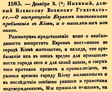 Рассмотрев представление ваше о необходимости воспретить Евреям постоянное в городе Киеве жительство, и находя, что пребывание их в оном вредно для промышлености города сего и для самой казны, и сверх того противно правам и привиллегиям, в разные времена городу Киеву жалованным и в последствии особыми указами и грамотами подтвержденным, Мы признали нужным, на счеи поселившихся в Киеве Евреев, постановить следующие меры: 1) Евреи не могут иметь в Киеве ни постоянного пребывания, ни заведений для отправления их обрядов или промышленности, ни записываться в тамошнее градское общество. 2) Евреи купцы 1 и 2 гильдии могут туда приезжать на контракты и ярмарки и торговать во время оных в лавках; но им воспрещается давать доверенности Евреям купцам 3 гильдии и мещанам для того, чтобы сии последние под таковым предлогом попользовались там промыслами, им запрещёнными<...>