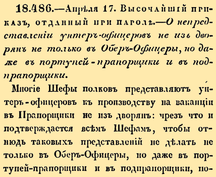 18.486. Высочайший приказ, отданный при пароле. 28 апреля (17 апреля ст.ст.) 1798 года. Царствование Императора Павла IО непредоставлении унтер-офицеров не из дворян не только в Обер-Офицеры, но даже в портупей-прапорщики и в подпрапорщики.Многие Шефы полков представляют унтер-офицеров к производству на ваканции в Прапорщики не из дворян: чрез что и подтверждается всем Шефам, чтобы отнюдь таковых представлений не делать не тольков Обер-Офицерыц, но даже в портупей-прапорщики и в подпрапорщики, потому что в оных званиях одни только дворяне должны состоять.