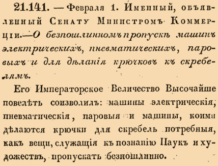 Его Императорское Величество Высочайше повелеть соизволил: машины электрическия, пневматическия, паровыя и машины, коими делаются крючки для скребель потребныя, как вещи, служащия к познанию Наук и художеств, пропускать безпошлинно.
