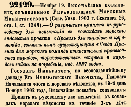 22129. — 2 декабря (19 ноября по ст.ст.). Высочайшее повеление, объявленное Управляющим Морским Министерством, 1902 г.О разрешении принять к руководству для испытания в командах морского ведомства проект «Правил для парадов и церемоний» Государь Император, по всеподданейшему докладу Его Императорского Высочества, Главного Начальника флота и морского ведомства , в 19-й день Ноября 1902 года, Высочайше повелеть соизволил:Принять к руководству для испытания в командах морского ведомства в течение 3-х лет проект «Правил для парадов и церемоний», взамен ныне существующего «Свода Правил для морских команд относительно производства парадов, торжествующих встреч и нарядов войск на погребение, изд. 1887 года».