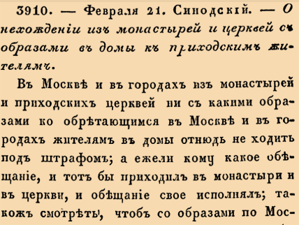 3910. 1722 год. 4 марта (21 февраля ст.ст.) Синодский. О нехождении из монастырей и церквей с образами в домы к приходским жителям.В Москве и в городах из монастырей и приходских церквей ни с какими образами к обретающимся в Москве и в городах жителям в домы отнюдь не ходить под штрафом; а ежели кому какое обещание, и тот бы приходил в монастыри и в церкви, и обещание свое исполнял; також смотреть, чтобы с образами по Москве, и в городах и в уездах, яко бы для собирания в церкви или в строение церкви, отнюдь не ходить; а ежели будут ходить, и таковых брать в приказ Церковных дел и следовать, и указ чинить по указам.