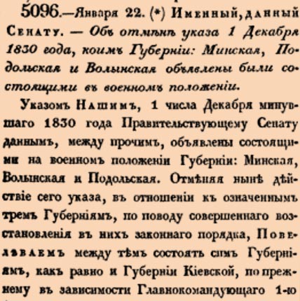 Закон № 5096. 1832 год. 22 января (3 февраля). Указ Императора Николая I об отмене военного положения в Минской, Подольской и Волынской губерниях с сохранением военной юрисдикции в отношении дел участников Польского восстания 1830–1831 годов.