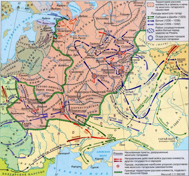 Монголо-татарское нашествие, 13 век«2 февраля [1238 г.] Татары явились под стенами Владимира: народ с ужасом смотрел на их многочисленность и быстрые движения. Всеволод, Мстислав и Воевода Петр Ослядюкович ободряли граждан. Чиновники Батыевы, с конным отрядом подъехав к Златым вратам, спрашивали, где Великий Князь, в столице или в отсутствии? Владимирцы вместо ответа пустили несколько стрел; неприятели также, но кричали нашим: не стреляйте, и Россияне с горестию увидели пред стеною юного Владим...