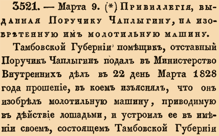 3521. 1830 год. 21 марта (9 марта ст.ст.). Привиллегия, выданная Поручику Чаплыгину, на изобретенную им молотильную машину. <…> Изобретение сие состоит главнейшее в следующем: на горизонтальном вале, находящемся в молотильной машине, утверждены три обода, имеющие по два аршина в диаметре, один в средине, а два по концам; между ободами сими укреплены по краям их в трех местах в равном разстоянии по два, один над другим валика (молотильника); около ободов в некотором разстоянии параллельно утверждены: с одной стороны сделанный из досок навес, а с другой из брусков решетка <…>