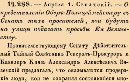14288. 1775 год. 12 апреля (1 апреля ст.ст.) Сенатский. О представлении Обер-Полицмейстеру в Сенат тех просителей, кои будут на улице подавать просьбы Ея Величеству.Правительствующему Сенату Действительный Тайный Советник Генерал-Прокурор и Кавалер Князь Александр Алексеевич Вяземский предлагал, что оказываются продерзкие люди, кои не сохраняя состоявшиеся многие уже в прошлых годах Именные Ея Императорскаго Величества и Правительствующаго Сената в народ изданные указы, коими накрепко запрещается, минуя учрежденныя правительства и персоны, подавать в собственныя Ея Величества руки челобитныя, подают однако ж оныя в такое время, когда Ея Величество соизволит иметь из дворца выход <…>