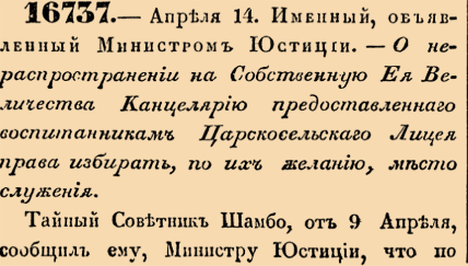 16737. 1843 год. 14 апреля (26 апреля). Именный, объявленный Министром Юстиции. О нераспространении на Собственную Ея Величества Канцелярию предоставленнаго воспитанникам Царскосельскаго Лицея права избирать, по их желанию, место служения
