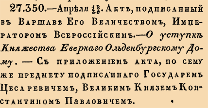 27350. 1818 год. 18 апреля (30 апреля). Акт, подписанный в Варшаве Его Величеством, Императором Всероссийским. О уступке Княжества Еверскаго Ольденбургскому дому.