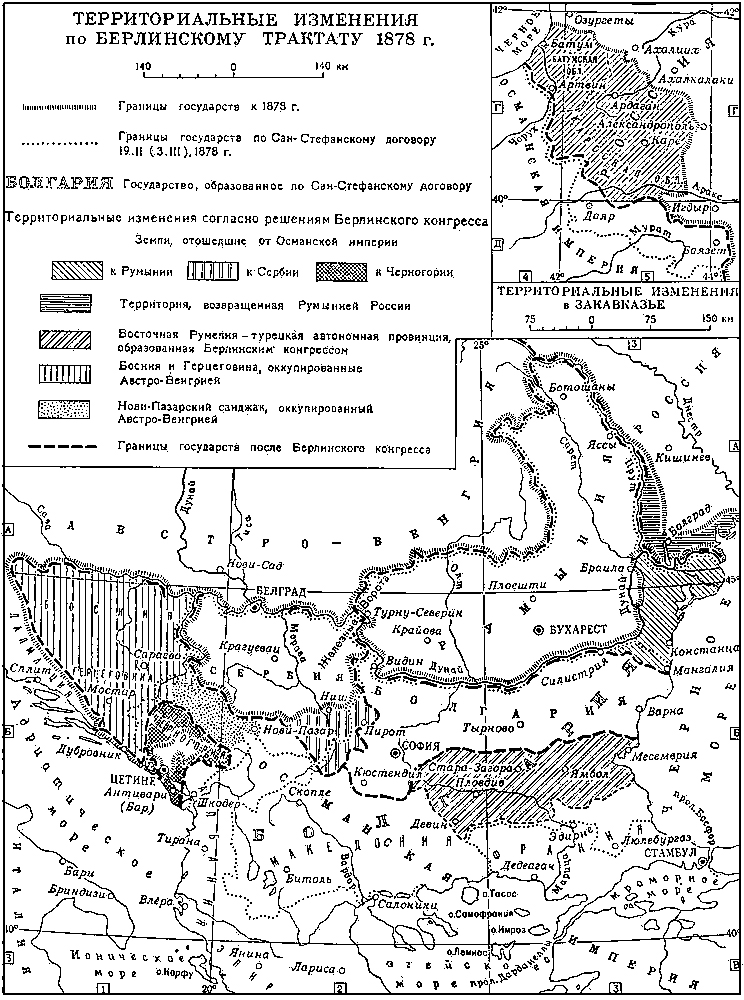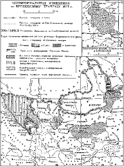«Берлинский конгресс 1878 года - происходил с 13 июня по 13 июля. Созыв конгресса был вызван недовольством Австро-Венгрии и Англии условиями Сан-Стефанского мирного договора 1878 года. Эти страны добивались, чтобы условия, выгодные для России и славянских государств на Балканах, подверглись обсуждению конгресса европейских держав, подписавших в 1856 году Парижский мирный договор. 5 февраля 1878 года (ещё до заключения Сан-Стефанского договора) Австро-Венгрия обратилась с циркулярной нотой к державам, подписавшим Парижский договор 1856 года и Лондонский 1871 года, предлагая созвать в Вене европейскую конференцию для решения спорных вопросов, вытекавших из положения, создавшегося в результате русско-турецкой войны 1877-78 гг. Руководитель внешней политики России канцлер Горчаков, соглашаясь на созыв конгресса вообще, категорически возражал против созыва его в Вене. Он обратился к посредничеству Бисмарка, ссылаясь на дружбу, лежащую в основе соглашения трёх императоров, чтобы согласовать противоположные интересы России и Австро-Венгрии и удержать Австрию от сближения с Англией. Бисмарк в речи, произнесённой в рейхстаге, заявил, что он должен ограничиться только ролью "честного маклера" и никогда не пожертвует традиционной "в течение нескольких поколений испытанной дружбой" ради того, чтобы взять на себя неблагодарную роль третейского судьи в таком вопросе, как восточный, который непосредственно не затрагивает интересов Германии и поэтому должен решаться либо самими заинтересованными сторонами, т. е. Австро-Венгрией и Россией, Англией и Россией, либо, когда дело идёт о территориальных изменениях, - всеми державами, подписавшими Парижский договор. Наиболее непримиримую позицию заняла Англия, боявшаяся захвата проливов Россией. Английское правительство потребовало, чтобы на предстоящем конгрессе были подвергнуты пересмотру все пункты Сан-Стефанского договора. Сменивший склонного к уступкам графа Дерби на посту министра иностранных дел Солсбери весьма резко заявил, что условия Сан-Стефанского мира безмерно расширяют влияние России на Востоке, подчиняют этому влиянию не только все страны, прилегающие к Чёрному морю, но и Иран и ставят под удар английские коммуникации в Средиземном море с важным для Англии Суэцким каналом. Правительство Биконсфильда начало демонстративные военные приготовления, чтобы показать, что Англия будет защищать свои требования вплоть до объявления войны России. Австро-Венгрия в лице министра иностранных дел графа Андраши, упрекая русское правительство в нарушении условий, принятых перед войной, предъявила ряд требований, дополнительных по сравнению с Рейхштадтским соглашением 1876 года и Будапештской конвенцией 1877года. Требования Андраши имели целью расширить австро-венгерскую сферу влияния к югу от Боснии и Герцеговины (Новобазарский санджак) и не допустить выхода Черногории к морю. Россия решительно возражала, и угроза войны с Англией осложнилась для неё возможной войной с Австро-Венгрией. Так как Россия, ослабленная войной, не могла решиться на новую войну против двух европейских государств, Горчаков решил идти на уступки Австро-Венгрии, правильно рассчитывая, что австро-венгерские контртребования менее опасны, чем требования англичан о полном пересмотре условий Сан-Стефанского договора, и что Ан