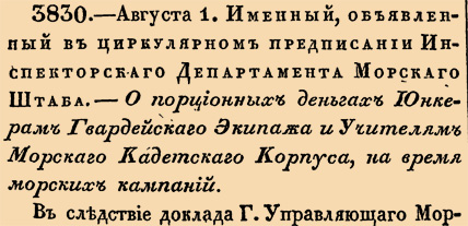 3830. 1830 год. 1 августа (13 августа). Именный, объявленный в циркулярном предписании Инспекторскаго Департамента Морскаго Штаба. О порционных деньгах Юнкерах Гвардейскаго Экипажа и Учителям Морскаго Кадетскаго Корпуса, на время морских кампаний.