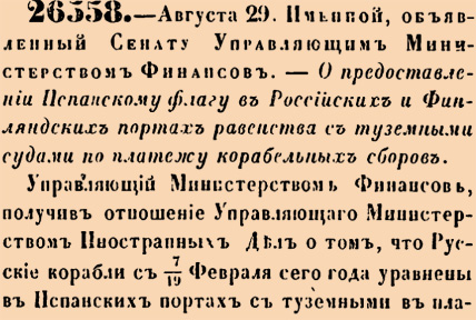 26358. 1852 год. 10 сентября (29 августа ст.ст.) Именной, объявленный Сенату Управляющим Министерством Финансов. О предоставлении Испанскому флагу в Российских и Финляндских портах равенства с туземными судами по платежу корабельных сборов.Управляющий Министерством Финансов, получив отношение Управляющаго Министерством Иностранных Дел о том, что Русские корабли с 7/19 Февраля сего года уравнены в Испанских портах с туземными в платеже корабельных сборов, и по предварительном сношении по сему предмету с Исправляющим должность Финляндскаго Генерал-Губернатора, он Управляющий Министерством Финансов, входил к Государю Императору с всеподданнейшим докладом <…>