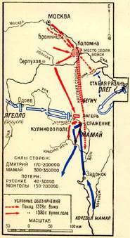 Куликовская битва явилась триумфом великого князя Дмитрия Ивановича, которого народ в память победы на Дону стал называть Донским. Дмитрий Донской не только разработал блестящий стратегический план войны с Мамаем и сумел последовательно провести его в жизнь, но и показал во время «Мамаева побоища» большое личное мужество и самопожертвование. Как простой ратник, он сражался с мечом в руках на самых опасных местах, сначала в «сторожевом полку», затем в само» центре русского строя. По словам летописца, Дмитрий Донской «бился... став на первом сступе, и много ударяли по голове его, и по плечам его», однако крепкие доспехи спасли жизнь великого князя. «Все доспехи его избить и пробиты, но на теле его не было ни одной раны. А бился он... лицом к лицу, став впереди в первой схватке, справа и слева от него дружину его били, самого его обступили вокруг, как обильная вода по обе стороны, много ударов ударялось по голове его и по плечам и по животу, но от всех ударов бог защитил его в день битвы, и таким образом среди многих воинов он сохранен был невредимым».