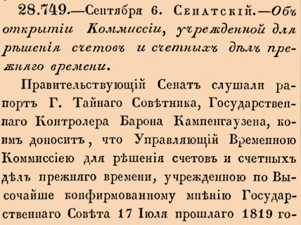 28749. 1821 год. 6 сентября (18 сентября). Об открытии Коммиссии, учрежденной для решения счетов и счетных дел прежняго времени.