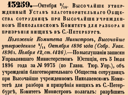 13259. 1896 год. 14 октября (2 октября ст.ст.) Высочайше утвержденный Устав благотворительнаго Общества сотрудниц при Высочайше учрежденном Николаевском Комитете для разбора и призрения нищих в С.-Петербурге<…>№2. Деятельность Общества заключается: 1) в исполнении, по отношению нищих женщин, тех же обязанностей, которыя правилами Комитета возлагаются на его сотрудников по отношению нищих мужчин. 2) в изследовании положения нищих женщин и их семейств и оказании им соответственнаго пособия <…>