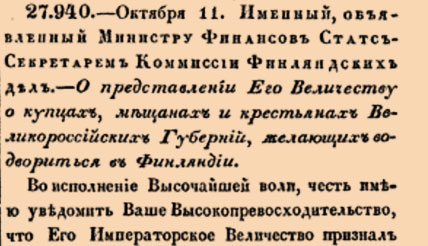 О представлении Его Величеству о купцах, мещанах и крестьянах Великороссийских Губерний, желающих водвориться в Финляндии <….>