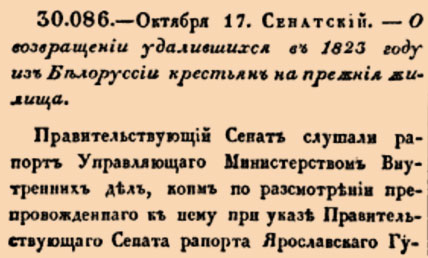 О возвращении удалившихся в 1823 году из Белоруссии крестьян на прежния жилища.