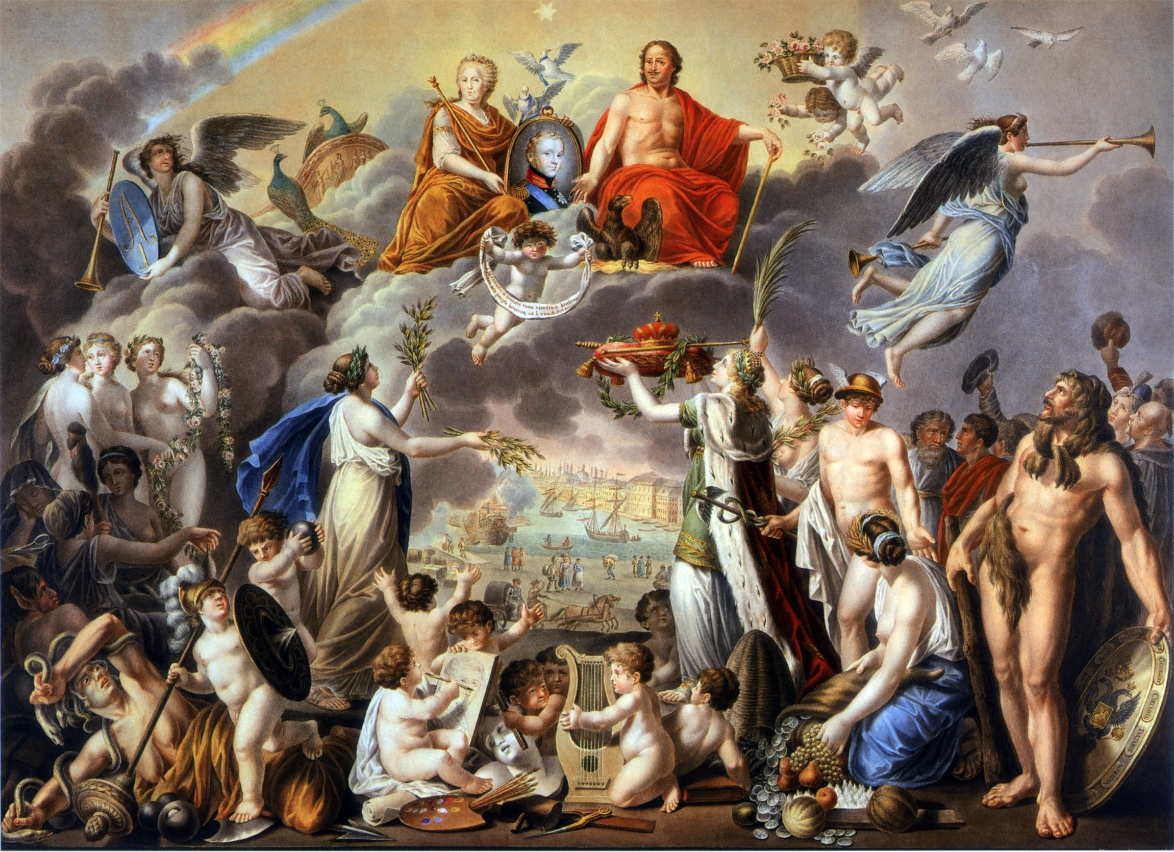 Апофеоз Александра I — аллегория на восшествие его на престол. Автор: Винсент Нойман 50,6 х 68,8 см Бум., акв., тушь, графитный и черный карандаш Ок. 1805 г. Фрагмент. Смотреть полностью.