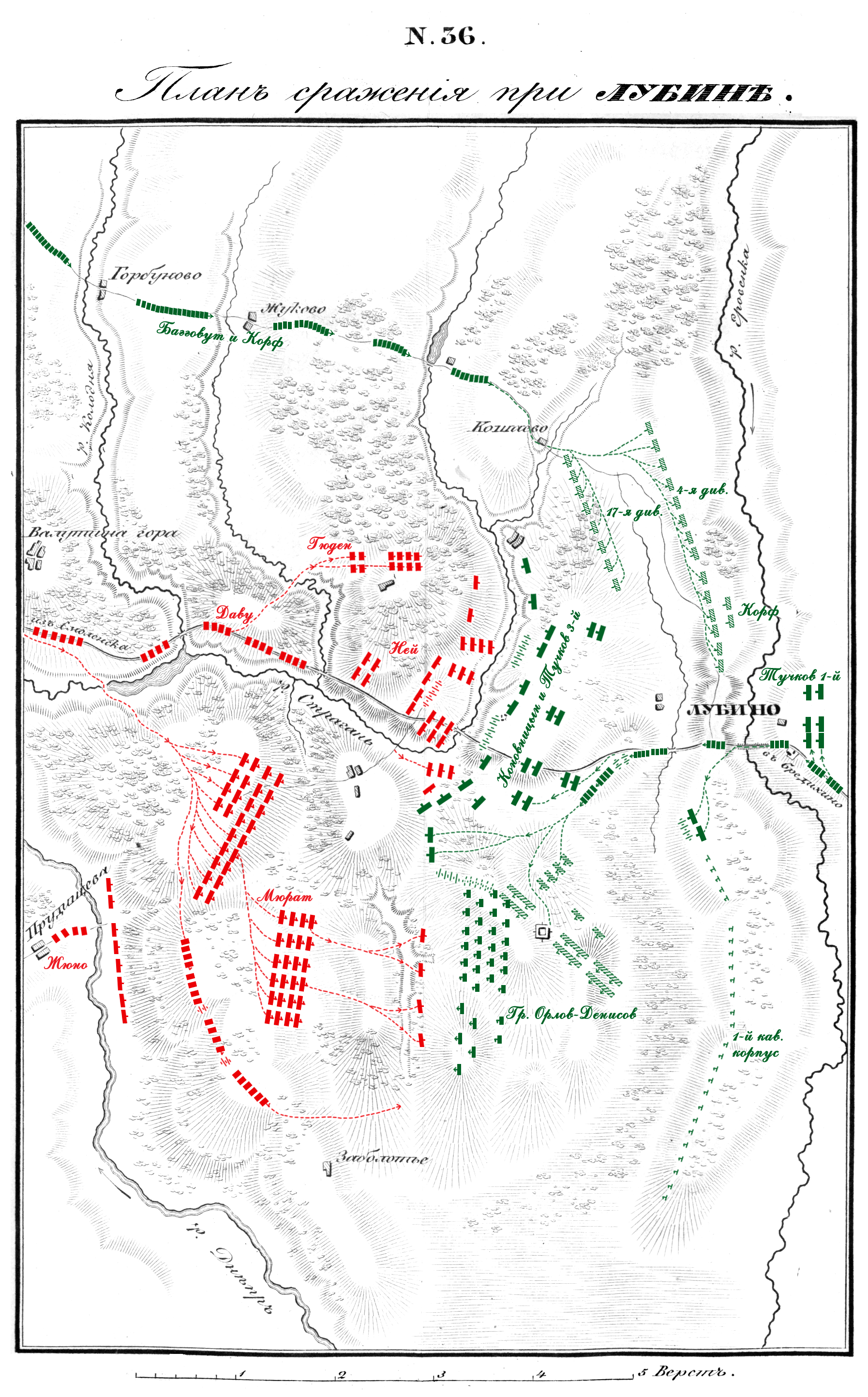Лубино находилось: близко от соединения обеих дорог, куда не пришли еще ни Багговут, ни Корф. Следственно, должно было, до прибытия их, всеми средствами удерживать неприятеля. В 11 часов завязалась перестрелка на передовой цепи Тучкова 3-го, и огонь становился сильнее, по мере прибытия Неева корпуса, из окрестностей Гедеонова, на столбовую дорогу. Ней открыл пушечную пальбу и послал конницу против нашей батареи. Тучков 3-й отступил за Страгань, разобрал на ней мост, и геройски решился держаться до крайности, видя, что отступлением он мог предавать во власть Французов места, где соединяются дороги и должны былии выходить Багговут и Корф. Ней, со своей стороны, наблюдая движение нашей армии, и, постигая, какой вред мог он нанести ей, если бы удалось ему оттеснить отряд Тучкова 3-го за точку соединения дорог, усиливал нападения…