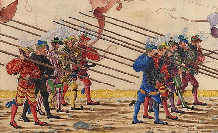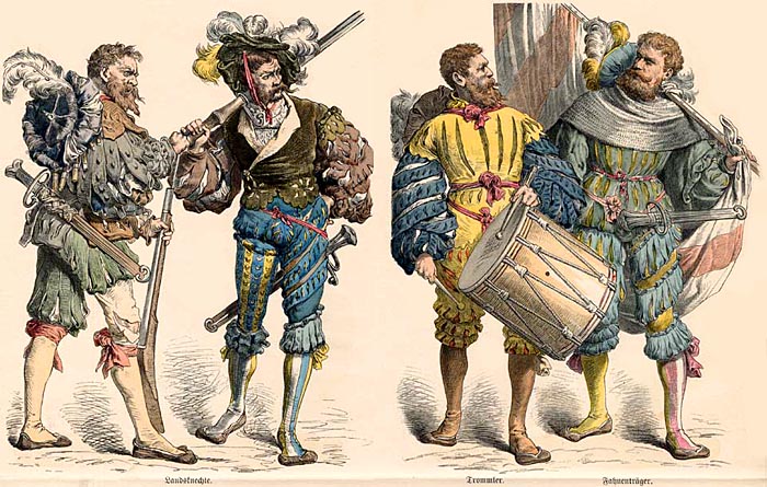 XVI век. Ландскнехты – «законодатели моды». Император Максимилиан I освободил их от действия законов, ограничивающих роскошь в одежде, признавая, что их жизнь и без того «коротка и безрадостна». Основные сведения о средневековых наемниках, которые применительно к Германии называются ландскнехтами (нем. Landsknecht), дает одноименная статья из Энциклопедического словаря Брокгауза и Ефрона, базирующаяся на работах немецких авторов XVII и XIX вв.: «Ландскнехты. – Так называемые пешие наемные войска, появившиеся в Германии в XV в., и существовавшие до начала XVII в. Впервые ландскнехты были сформированы императором Максимилианом I в 1482 г., для противовеса феодальным владельцам и с целью устройства постоянного войска. Первоначально они набирались из жителей Тироля и Швабии, затем их комплектовали из всех немецких земель… Каждая часть полка (Fahne, Fähnlein) составлялась из 400 ландскнехтов, разделявшихся на роты, а роты – на копья. Вооружение ландскнехта – копье, меч, первоначально лук и стрелы, впоследствии и мушкет. Ландскнехты имели свой суд, который составляли выборные или весь полк; в числе наказаний применялись смертная казнь (закалывание пиками), изгнание из службы, арест (в цепях и простой), денежный штраф и проч. За полком ландскнехтов обыкновенно вместе с обозом тянулись торговцы, барышники, конюхи, женщины и т.д.»