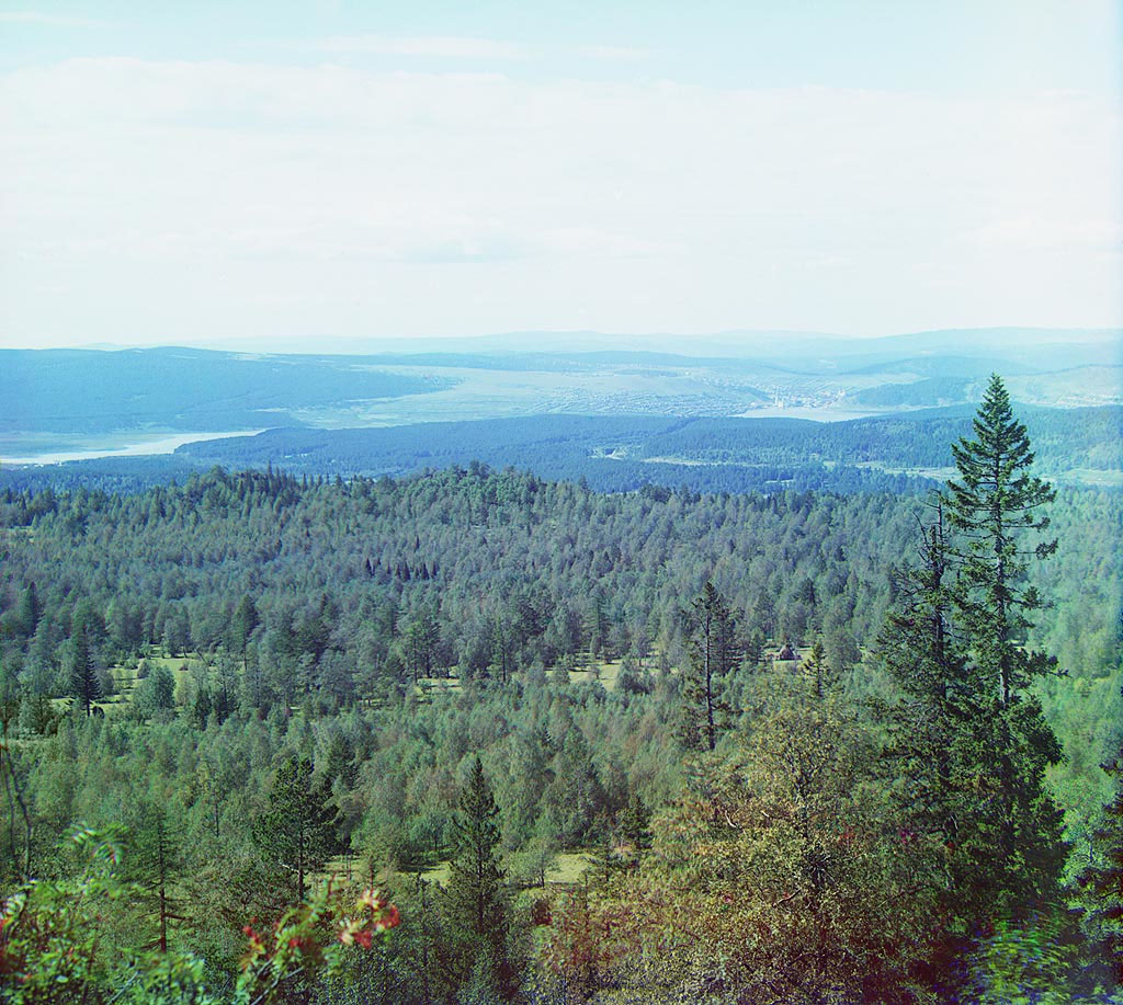 Златоуст виден вдали в правой половине фотографии Отсюда виден весь город целиком. Перед ним городской пруд на реке Ай, справа гора Косотур. Над городом возвышаются два больших храма с колокольнями: слева у берега пруда - Троицкий собор, правее и дальше - Никольская церковь.