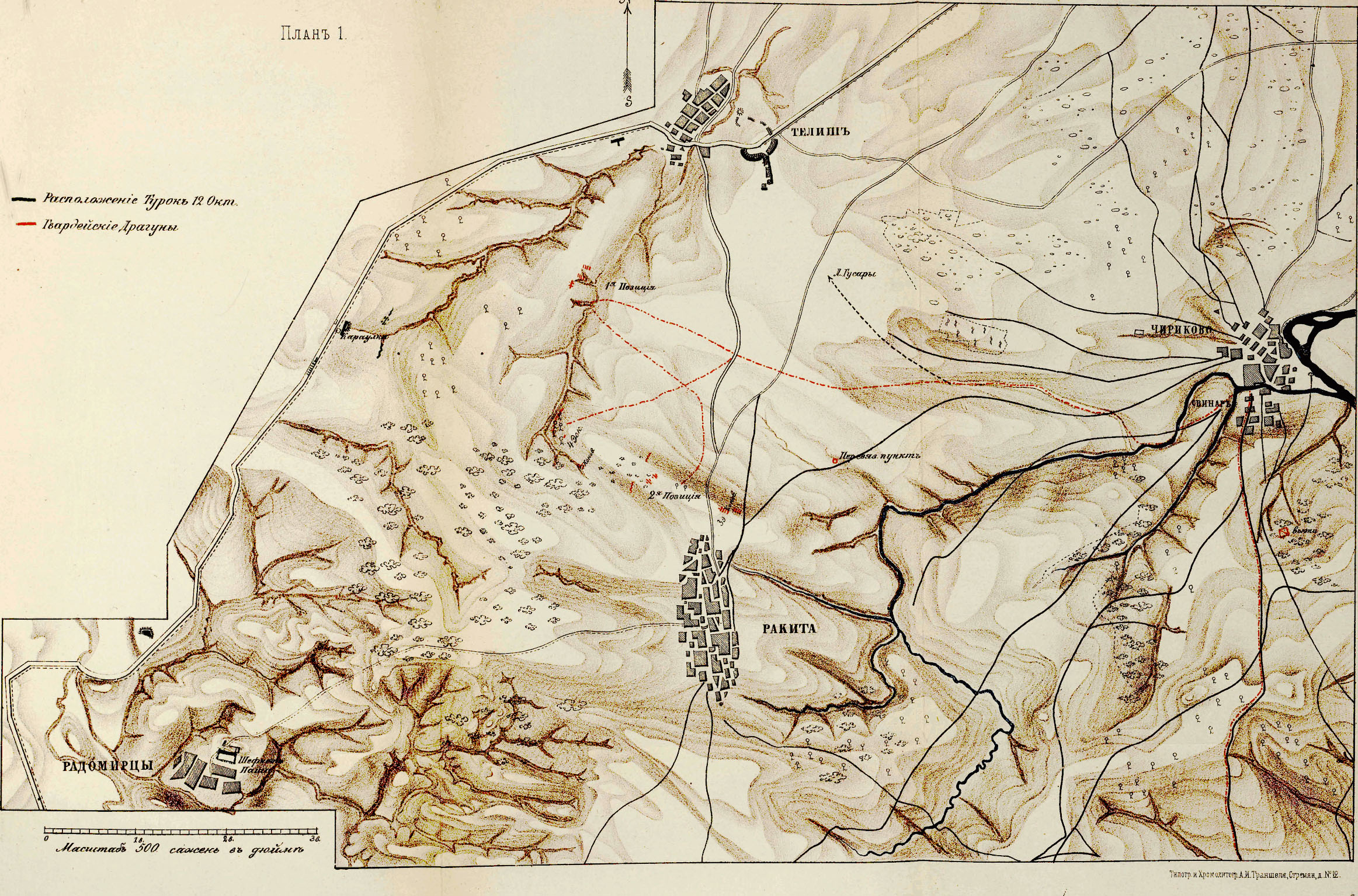 В 7 часов утра, когда уже стало рассветать, командующий полком полковник Ковалевский получил приказание, присоединив к себе взвод 5-й гвардейской конной артиллерии капитана Мартынова, двинуться вперед и действовать во время боя на левом фланге всей атаки, охраняя тыл Лейб-Егерей, когда они, завернув левым плечом, двинутся на Телиш. Немедленно полк вытянулся из оврага, выслав вперед на рысях наездников от всего полка под командою капитала Мейнандера, для освещения местности по направлению к д. Раките и к Софийскому шоссе. Полк же сперва следовал во взводной общей колонне, имея между дивизионами взвод артиллерии, а выйдя на равнину, между Телитскими укреплениями и Ракитской горой, развернулся во взводных колоннах на тесных интервалах, имея артиллерию позади, подвигался по направленно к шоссе. К стороне д. Телиш был выслан разъезд из 8 человек с унтер-офицером по гребню идущего туда оврага. Лейб-Гусары завязали уже дело для обнаружения расположения ложементов неприятеля, а за ними следовали Лейб-Егеря. Было 9 часов утра; посланный к стороне Телиша разъезд был встречен выстрелами из ложементов и должен был отойти из-под огня назад и ограничился только наблюдением с этой стороны.