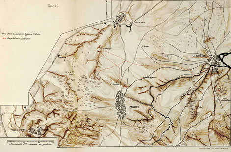 11-го числа вечером, приказом по полку, велено было приготовиться к выступлению, для чего пополнить сухарные саквы из запаса до 6-ти-дневной порции, людям взять с собою по 1/2 ф. вареной говядины и соли, а для лошадей суточную дачу ячменя иметь в саквах. Сено можно было найти везде на полях. Обоз велено было оставить на месте, а взять с собою только лазаретную линейку и вьючных офицерских лошадей. Еще ранее полуночи, в 11 ½ часов с 11-го на 12-е число, л.-гв. Гусарский и л.-гв. Драгунский полки с 5-ю конною батареею, под начальством командующего Гусарским полком полковника Мейндорфа, выступили из д. Бежаново. Выступление состоялось в полнейшей тишине; в полголоса отдавались приказания седлать лошадей, садиться и двигаться. Ночь была темная и довольно свежая. Отряд медленно вытягивался по дороге, через р. Вид на д. Свишар. У брода и при подъеме на скалистую гору, артиллерия замедлила несколько движение отряда. В 2Ѵ2 часа пополуночи, отряд достиг д. Свинар. Полуэскадрон от л.-гв. Гусарскаго полка служил авангардом отряда; потом следовал гусарский полк, за ним батарея, а далее Драгунский полк, имея у себя арьергард из 2-го полуэскадрона 4-го эскадрона. На протяжении всего отряда были высланы к стороне неприятеля дозорные. Так как ночь была тихая, то были приняты все меры, чтобы движение отряда не было замечено неприятелем, посты которого были расположены не далее трех верст за д. Свинар и Свинарского балкою. В д. Свинар были оставлены офицерские вьюки. Проследовав в таком же порядке через д. Свинар, отряд втянулся в Свинарскую балку. Здесь встретились большия затруднения при частых переездах через ручей, про-текающей в глубоком логовище, где артиллерия беспрестанно останавливалась, а орудия приходилось в иных местах перетаскивать через ручей, с помощью орудийной прислуги. Пройдя, лесную часть оврага, отряд собрался в 41/г часа утра, верстах в пяти от телишских укреплений, и остановился, в ожидании рассвета, в безмолвной тишине; к стороне Телиша на полверсты были выставлены от Драгун и Гусар пикеты из 6-ти человек каждый.