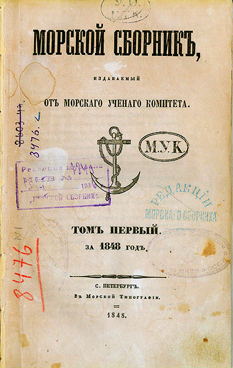 Титульный лист первого выпуска журнала «Морской сборник». 1848 г. Фрагмент. Смотреть полностью.