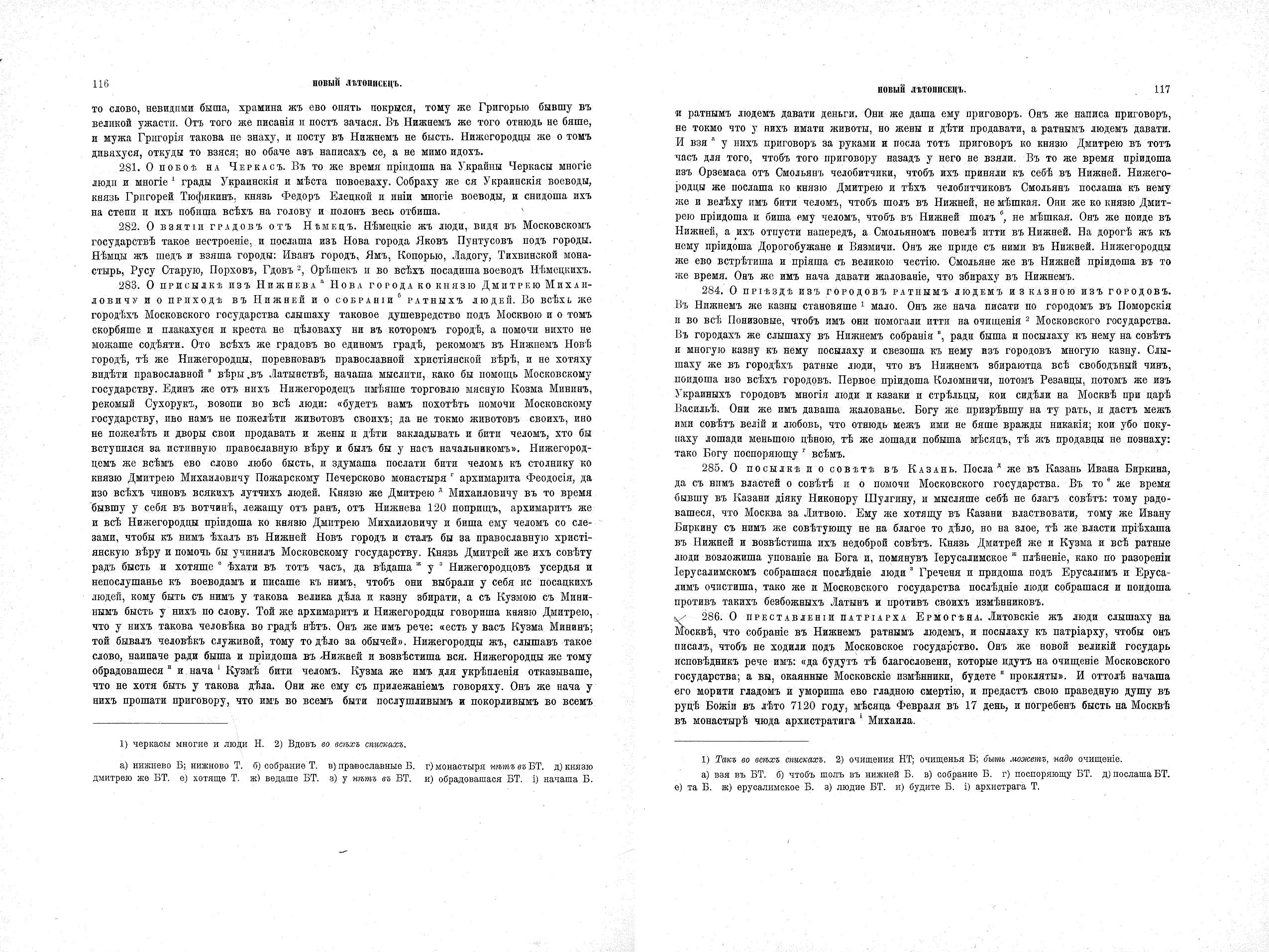 Новый летописец. О присылке из Нижнего Новгорода к князю Дмитрию Михайловичу, и о приходе в Нижний, и о собрании ратных людей Перевод. С. Ю. Шокарева. Текст воспроизведен по изданию: Хроники смутного времени. М. Фонд Сергея Дубова. 1998 См. также факсимиле страниц из Полного Собрания русских летописей (ПСРЛ) Т.14. 1-я половина. I. Повесть о честном житии царя и великого князя Феодора Ивановича всея Руссии. II. Новый летописец. Под ред. С. Ф. Платонова и П.Г. Васенко — СПб: Типография М.А. Александрова, 1910. 283. О присылке из Нижнего Новгорода к князю Дмитрию Михайловичу, и о приходе в Нижний, и о собрании ратных людей. Во всех городах Московского государства, услышав о такой погибели душ под Москвой, о том скорбели и плакали и креста не целовали ни в каком городе, а помощи никто не мог дать. Из всех городов в одном городе, называемом Нижний Новгород, те нижегородцы, поревновав о православной христианской вере и не желая видеть православной веры в латинстве, начали мыслить, как бы помочь Московскому государству. Один из них нижегородец, имевший торговлю мясную, Козьма Минин, прозываемый Сухорук, возопил всем людям: «Если мы хотим помочь Московскому государству, то нам не пожалеть имущества своего, да не только имущества своего, но и не пожалеть дворы свои продавать и жён и детей закладывать, и бить челом, кто бы вступился за истинную православную веру и был бы у нас начальником». Нижегородцам же всем его слово было любо, и придумали послать бить челом к стольнику ко князю Дмитрию Михайловичу Пожарскому архимандрита Печерского монастыря Феодосия да из всех чинов лучших людей. Князь же Дмитрий Михайлович в то время был у себя в вотчине, от Нижнего в 120 поприщах, лежал от ран. Архимандрит же и все нижегородцы пришли к князю Дмитрию Михайловичу и били ему челом со слезами, чтобы он ехал в Нижний Новгород и встал за православную христианскую веру и помощь бы оказал Московскому государству. Князь же Дмитрий их мысли был рад и хотел ехать тотчас, да зная у нижегородцев упрямство и непослушание воеводам, писал к ним, чтобы они выбрали из посадских людей, кому быть с ним у того великого дела и казну собирать, а с Кузьмою Мининым было у них все уговорено. Тот же архимандрит и нижегородцы говорили князю Дмитрию, что у них в городе такого человека нет. Он же им говорил: «Есть у вас Кузьма Минин; тот бывал служилым человеком, ему то дело привычно». Нижегородцы, услышав такое слово, ещё больше были рады, и пришли в Нижний, и возвестили всё. Нижегородцы же тому обрадовались и начали Кузьме бить челом. Кузьма же им для [их] укрепления отказывал, [говоря, что] не хочет быть у такого дела. Они же его прилежно просили. Он же начал у них просить приговор, чтобы им во всем быть послушными и покорными и ратным людям давать деньги. Они же дали ему приговор. Он же написал приговор, чтобы не только у них брать имущество, но и жен и детей продавать, а ратным людям давать [деньги]. И взяв у них приговор, за их подписями, послал тот приговор ко князю Дмитрию тотчас затем, чтобы того приговора назад у него не взяли. В то же время пришли из Арзамаса от смолян челобитчики, чтобы их приняли к себе в Нижний. Нижегородцы же послали ко князю Дмитрию, и тех челобитчиков смолян к нему послали же и велели им бить ему челом, чтоб в Нижний шёл не мешкая. Они же ко князю Дмитрию пришли и били ему челом, чтобы в Нижний ш