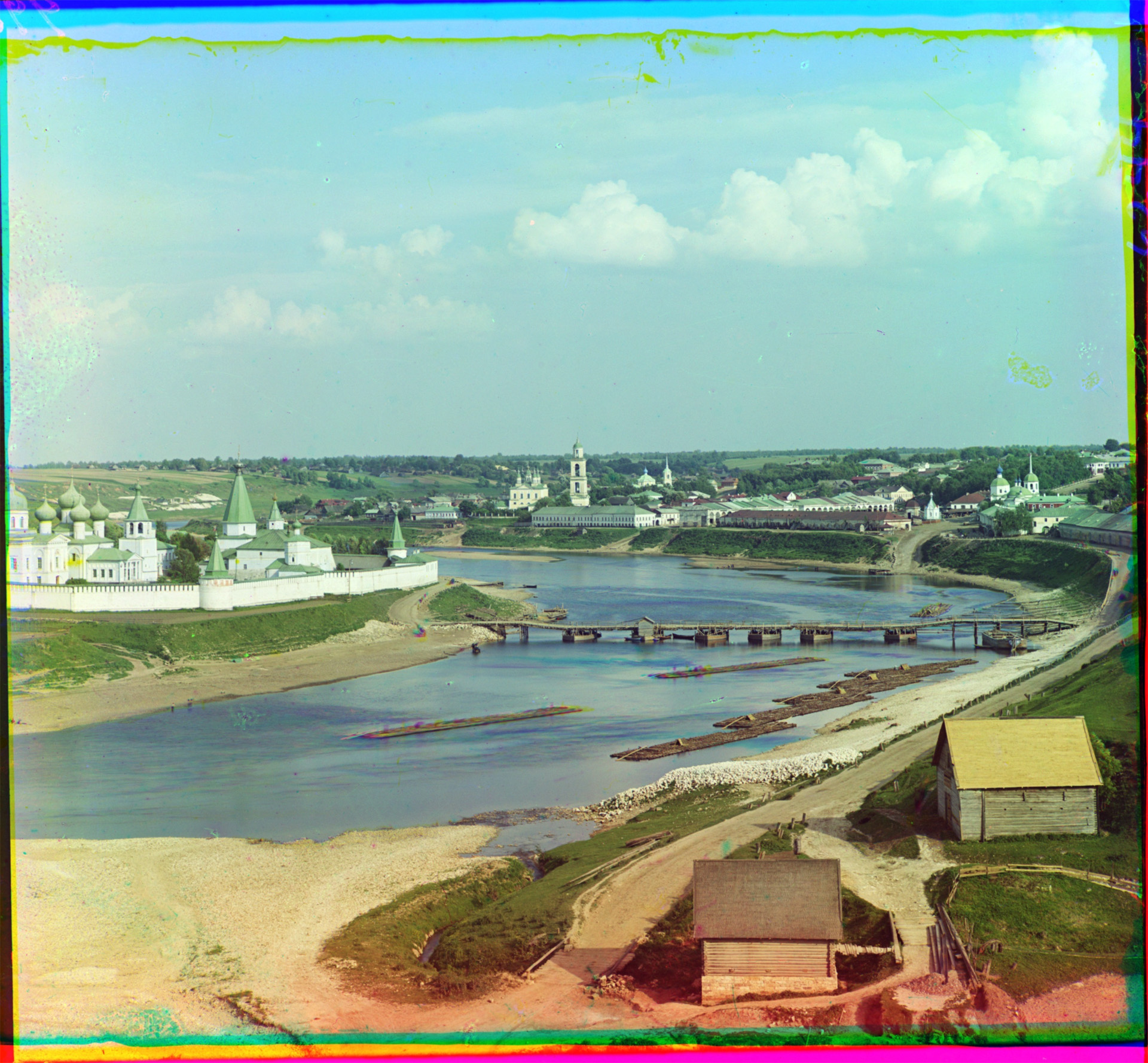 Город Старица. Общий вид с Волгой. [Лето 1910 года] Автор: Прокудин-Горский Сергей Михайлович Оригинальный цветоделенный тройной негатив Цветное совмещенное изображение в современной реконструкции Библиотека Конгресса США, кат.№ 1236 Фрагмент. Смотреть полностью.