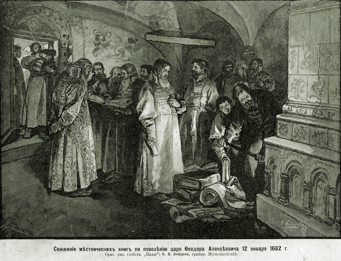 А от того вышепомянутаго 190 году [1682 г.], Генваря 12 числа, указал блаженные памяти Великий Государь, Царь и Великий Князь Феодор Алексеевич, всея Великия и Малыя и Белыя России Самодержец, Бояром и Окольничим и Думным и всяких чинов людем, на Москве в Приказех у расправных, и в полкех у ратных и у посольских, и везде у всяких дел быть всем меж себя без мест, и впредь никому ни с кем никакими случаи и местничествы не считаться, и никому ни на кого мимошедшими находки не возноситься; также и в потерках никого не укорять и не попрекать, и в укоризну прежних, где кто был и в нижнех чинех за скудостью, не ставить; также буде и впредь кто от скудости, или каким ни есть случаем объявится где в нижних каких чинех, и того тому в укоризну не ставить же, и тем никому никого не бесчестить. И для совершеннаго тех случаев и мест искоренения и вечнаго забвения те все прошедшия о случаех и о местех записки указал он Великий Государь предать огню. А впредь им и будущим их родом на память указал он Великий Государь быти в розряде родословной книге родом их, и тое родословную книгу пополнить, и которых имен в той книге в родех их не написано, и тех имяна в родословную книгу написать вновь к сродником их, и для того взять у них росписи за руками. А которые Княжеские и иные честные роды при предках его Государевых, и при нем Великом Государе были в честях, в Боярях и в Окольничих и в Думных Дворянях; или которые старых же и честных родов в таких вышеписанных честях и не явились, а с царства прадеда его Государева, блаженные памяти Великаго Государя, Царя и Великаго Князя Иоанна Васильевича, всея России Самодержца, и при его Государеве Державе, были в Послах и в Посланниках, и в полкех, и в городех в Воеводах; и в знатных посылках, и у него Великаго Государя в близости, а в родословной книге родов их не написано, и те роды с явным свидетельством написать в особую книгу. А которые роды и в вышеписанных честях и в знатных посылках не были, а с царства деда его Государева, блаженные памяти Великаго Государя, Царя и Великаго Князя Михаила Феодоровича, всея Великия России Самодержца, и при нем Великом Государе были в полковых Воеводах и в Послех, и в Посланниках, и в знатных каких посылках, и в иных честных чинех, и в десятнях написаны в первой статье: и тех родов имена написать по тому ж со свидетельством в особую книгу. А которые и в тех вышеписанных честных и знатных чинех не были, а в десятнях написаны в середней и в меньшей статьях, и тех имена написать в особую книгу. А буде кто из нижних чинов за службы отцов своих, или за свои, написаны в Московские чины, и тех имена написать в особую ж книгу по их росписям. А у того дела указал он блаженные памяти Великий Государь быть Боярину Князю Володимиру Дмитриевичу Долгорукову, да Думному Дворянину Алексею Ивановичу Ржевскому, да Розрядным Дьяком: Думному Василью Григорьевичу Семенову, да Федору Шакловитому. А Марта в 27 числе того ж 190 году, по указу ж блаженные ж памяти Великаго Государя, Царя и Великаго Князя Феодора Алексеевича, всея Великия и Малыя и Белыя России Самодержца, по докладной выписке велено: которых Княжеских и иных родов в розряде в родословной книге не написано, а они в росписях своих напишут прозвание свое, что они пошли от родословных людей, а родословные люди тех родов в поколенных своих росписях их прозвания не напишут, и