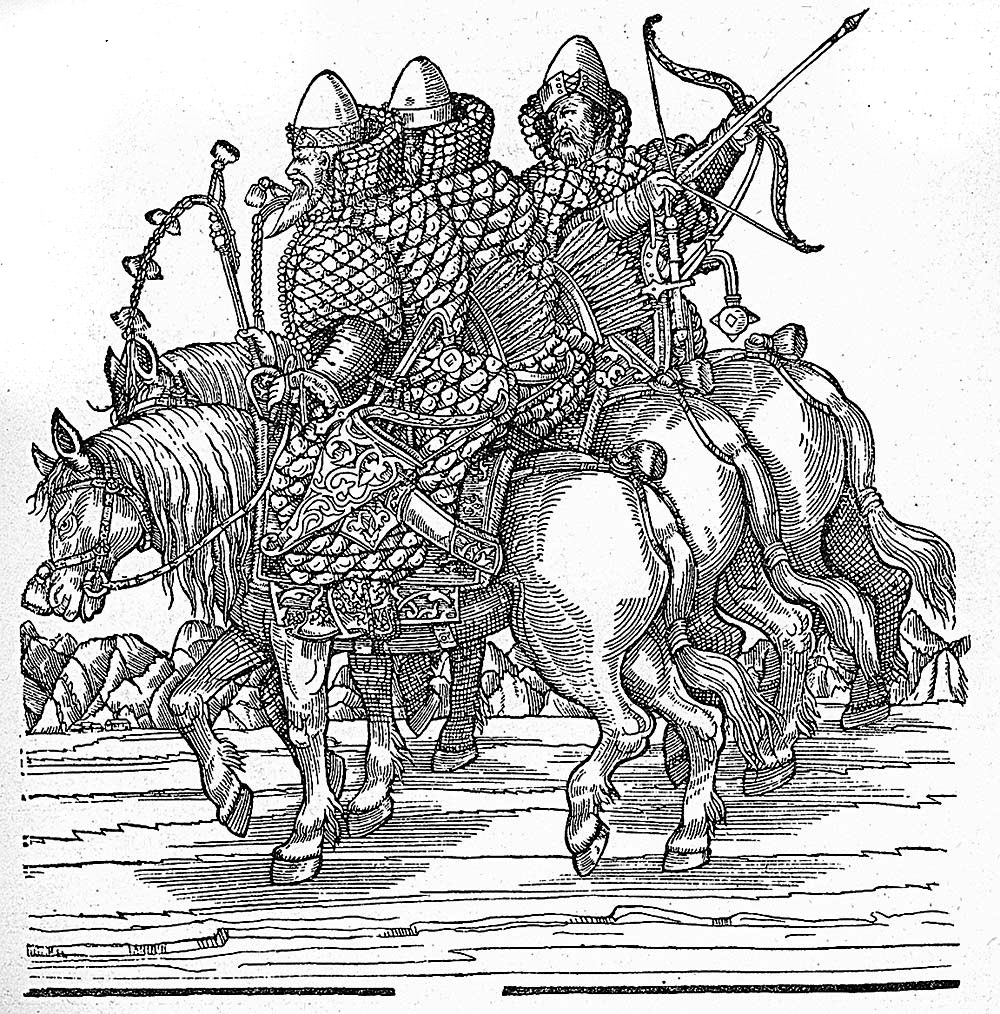 Вооружение русских всадников. Гравюра из немецкого издания книги Сигизмунда Герберштейна «Записки о Московитских делах», 1557 г. Воспроизводится по русскому изданию: Сигизмунд Герберштейн. Записки о Московитских делах. - СПб., 1908. - С. 77 СПб., 1908. - С. 77 Фрагмент. Смотреть полностью.