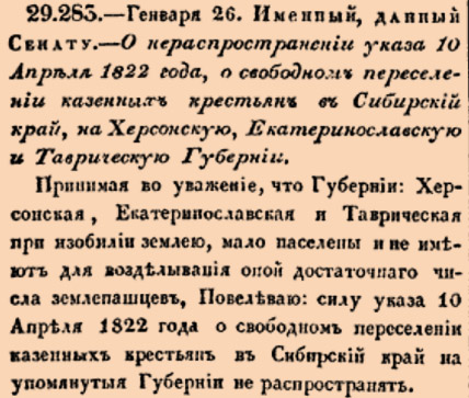 29.283. — 26 января (7 февраля). Именной [указ], данный Сенату. — О нераспространении указа от 10 апреля 1822 года «О свободном переселении казенных крестьян в Сибирский край» на Херсонскую, Екатеринославскую и Таврическую губернии.