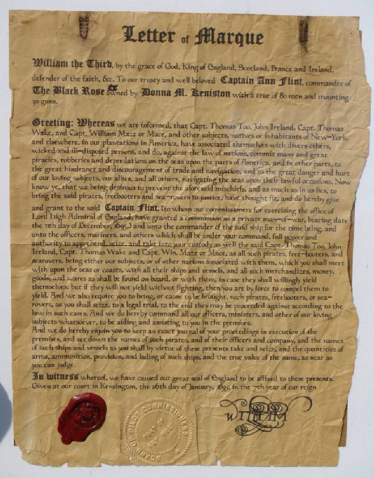 Типовое каперское свидетельство 1695 года, форма их не изменилась и в XVIII веке