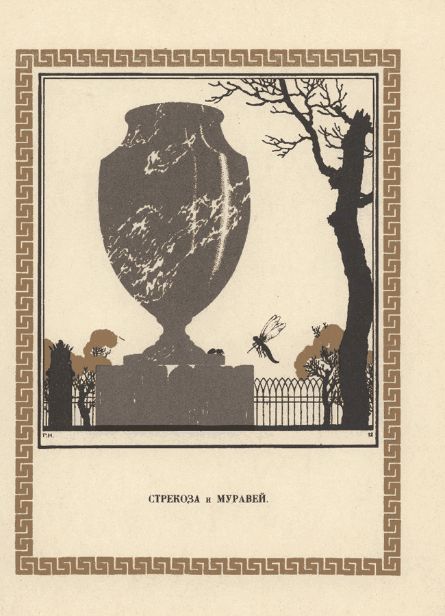Стрекоза и муравей. Лисица и Виноград. Кукушка и петух. – Санкт-Петербург – Москва, Издательство И. Н. Кнебель, Типография Р. Голике и А. Вильборг, 1912 – Художник Е. И. Нарбут.