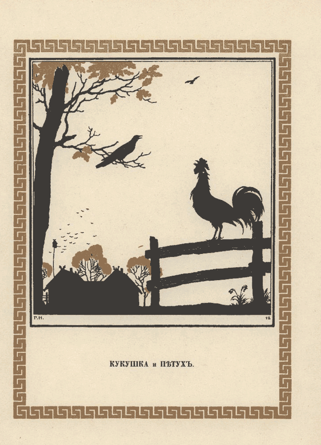 Стрекоза и муравей. Лисица и Виноград. Кукушка и петух. – Санкт-Петербург – Москва, Издательство И. Н. Кнебель, Типография Р. Голике и А. Вильборг, 1912 – Художник Е. И. Нарбут.