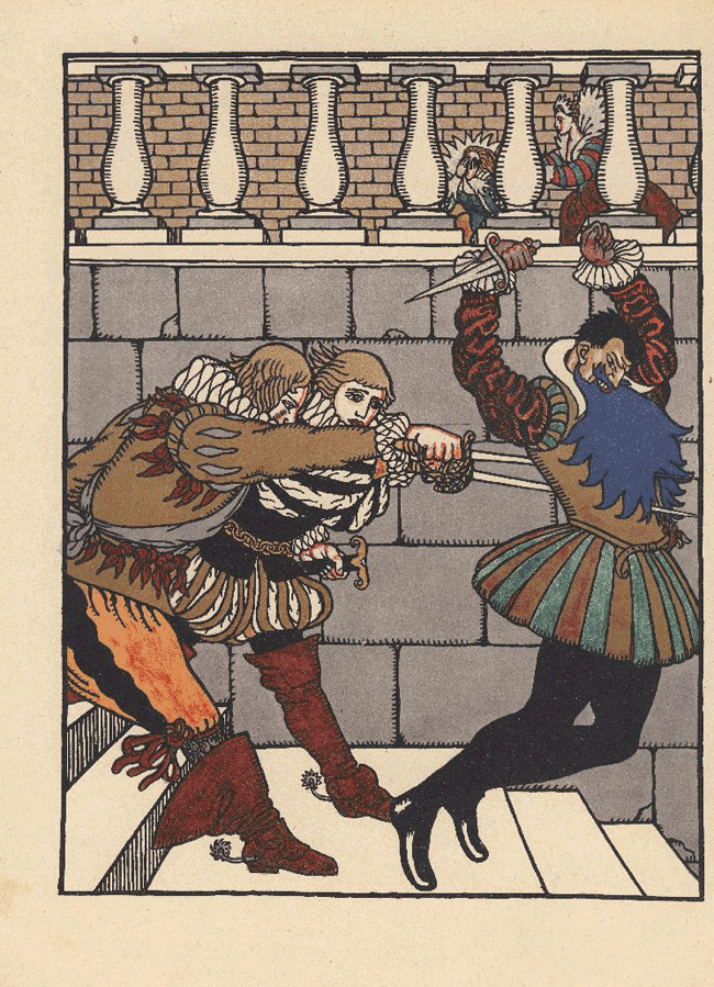 В это мгновение братья ворвались в комнату и бросились со шпагами прямо на синюю бороду. Иллюстрация к книге
