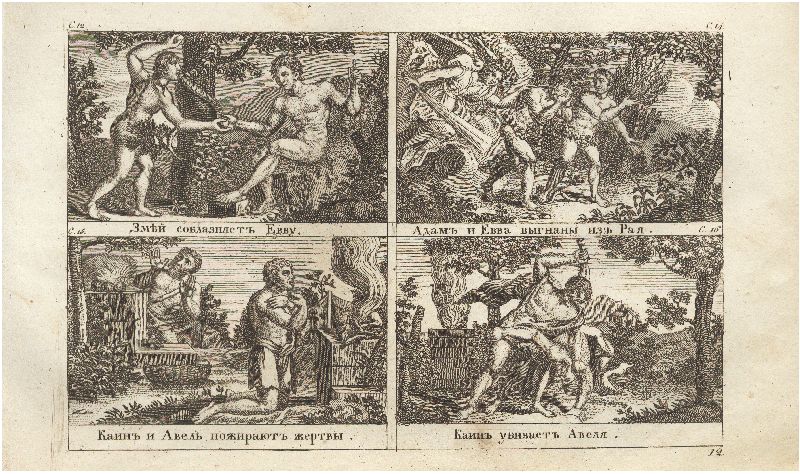 Змей соблазняет Еву. Адам и Ева изгнаны из рая. Каин и Авель пожирают жертвы. Каин убивает Авеля. Иллюстрации к книге