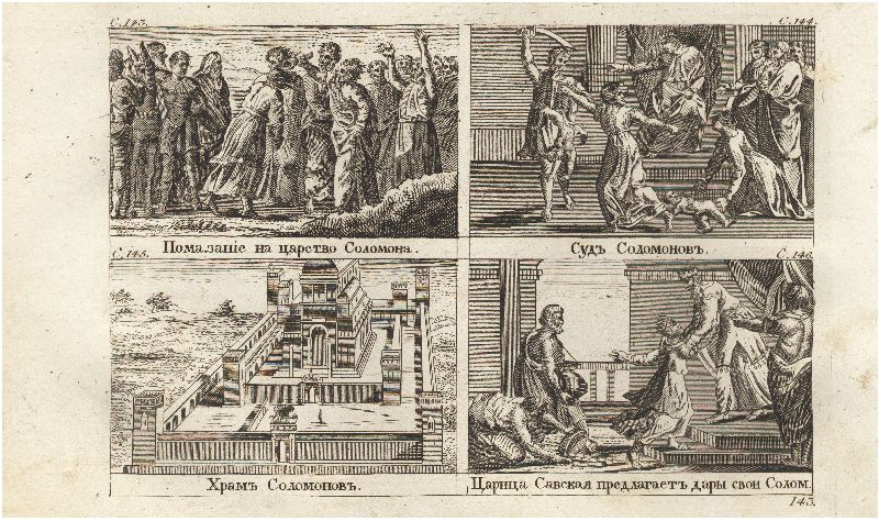 Помазание на царство Соломона. Суд Соломонов. Храм Соломонов. Царица Савская предлагает дары свои Соломону. Иллюстрации к книге