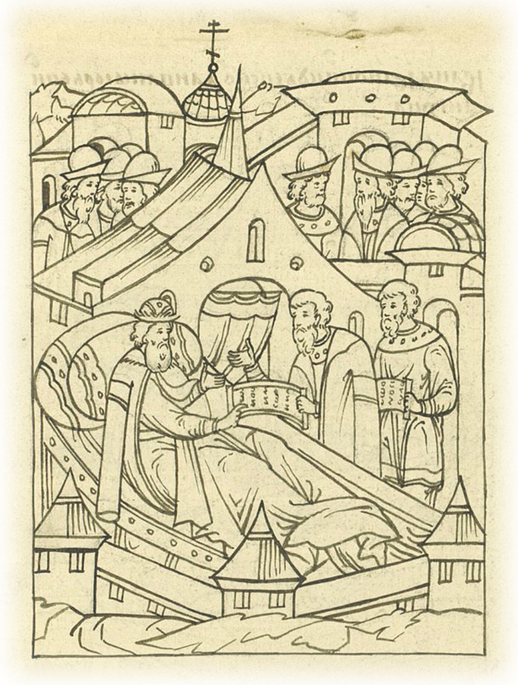 И пустил в думу к себе о духовных грамотах дворецкого своего тверского Ивана Юрьевича Шигону и дьяка своего Меньшого Путятина; и начал размышлять князь великий, кого еще пустить в ту думу и кому поручить свой государев приказ; а бояре тогда были на Волоке с великим князем: князь Дмитрий Федорович Бельский да князь Иван Васильевич Шуйский, да князь Михайло Львович Глинский, и дворецкие его, князь Иван Иванович Кубенский да Иван Юрьевич Шигона.