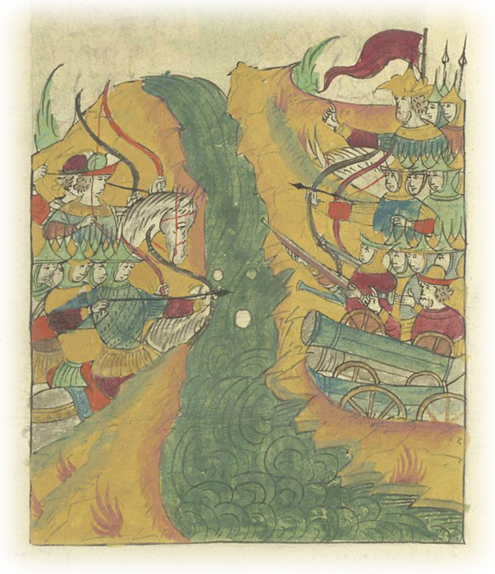 Крымский царь Саип-Гирей велит бить по передовому отряду великого князя из пушек и пищалей, чтобы перебраться за реку. На помощь передовому отряду приходят князья Семен Иванович Пунков Микулинский и Василий Семенович Серебряный Оболенский с полком и вста