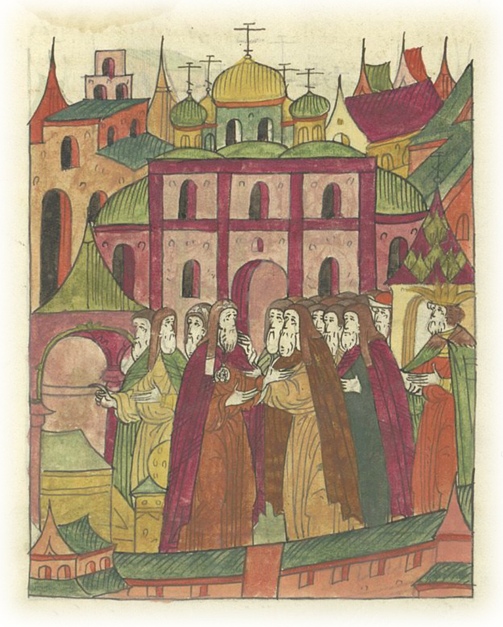 По совершении же божественной литургии и по снятии с митрополита служебной одежды архиепископы и епископы положили на него икону золотую воротную и мантию с источниками*, и клобук белый и возвели его на святительский престол каменный. * цветная полоса на одежде церковного служителя.