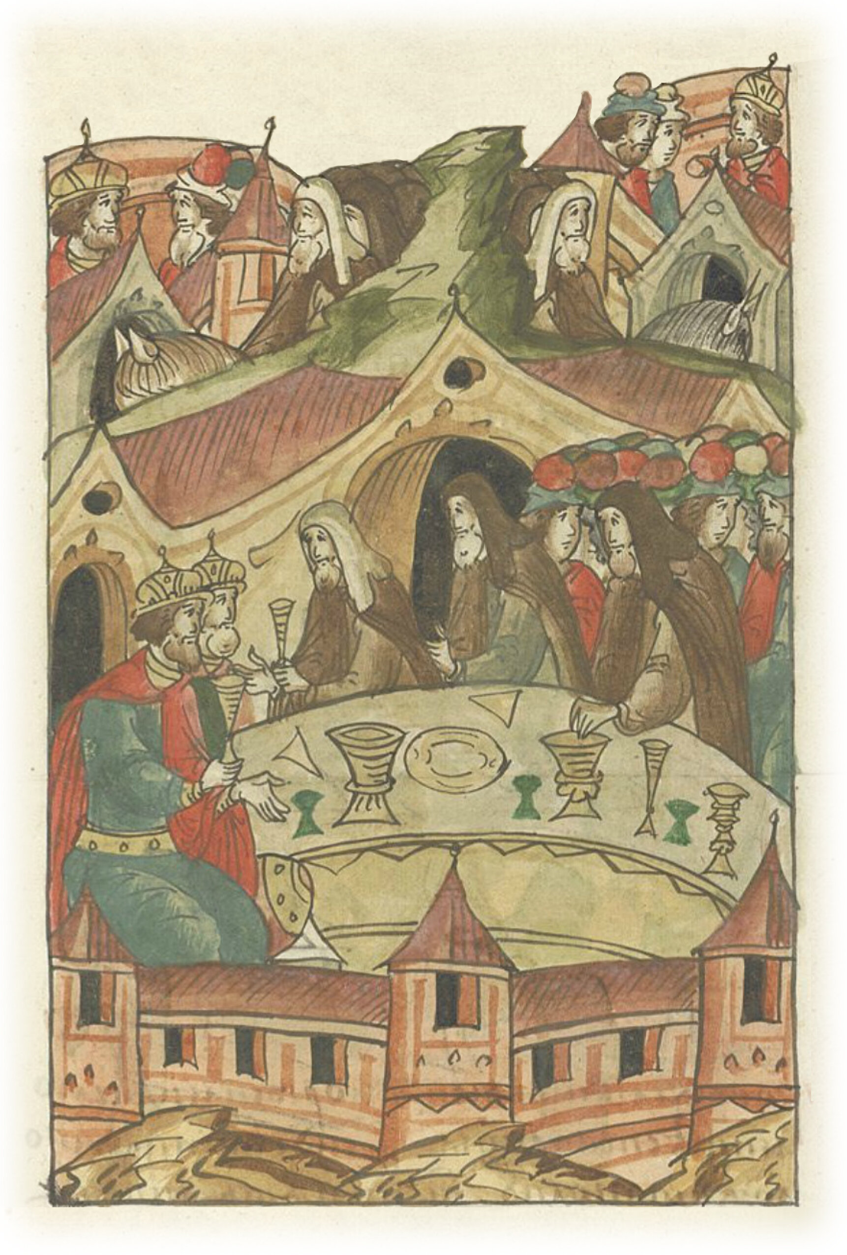 Князья Юрий и Ярослав Всеволодовичи чествуют митрополита, епископа и игумена Спасского, пришедших примирить Ярослава с князем Михаилом Черниговским.