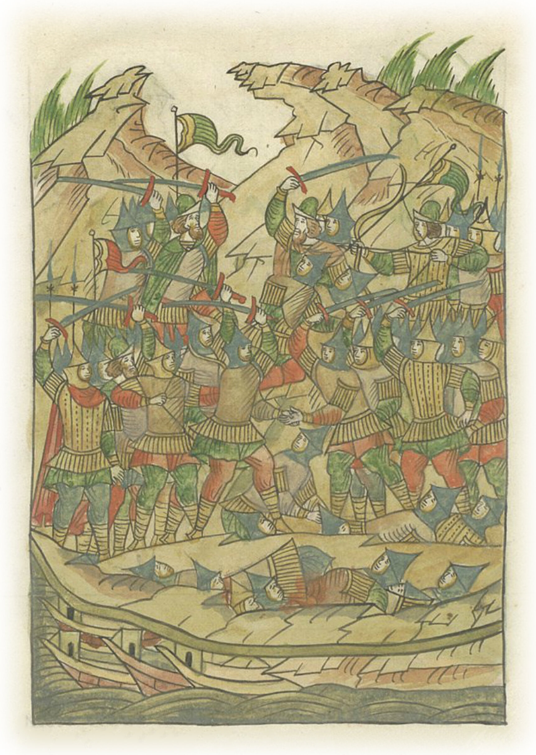 Бой между ними проходил так: выйдя из судов, обе рати пешие начали биться в третьем часу того дня, бились до захода солнечного; боролись и в рукопашную, и рубились; и знамя у двинян выбили.