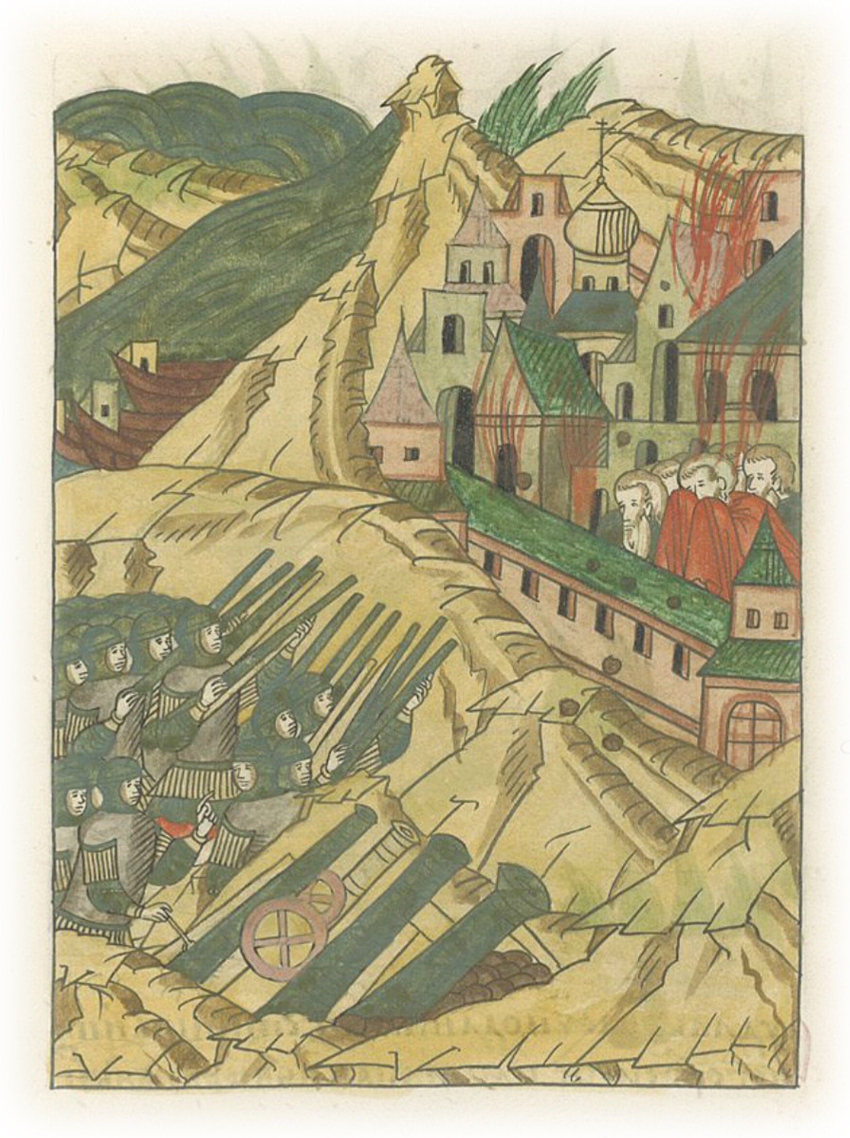 и начали приступать к городу с пушками и пищалями, и дворы в городе зажгли, огнем стреляя, так как не было им противника.
