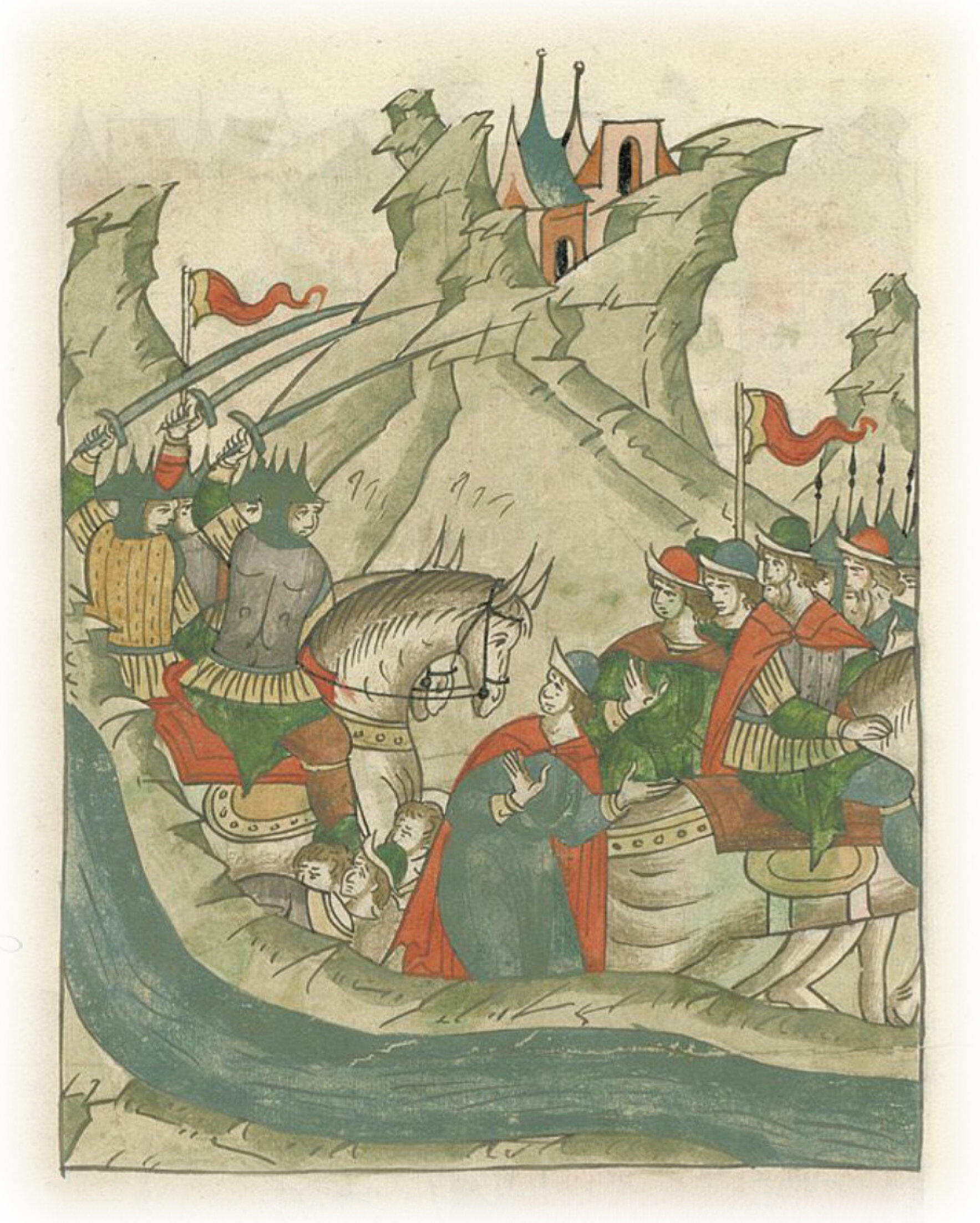 Немецкое войско внезапно встречает воевод великого князя и топит их, не успевших вооружиться.