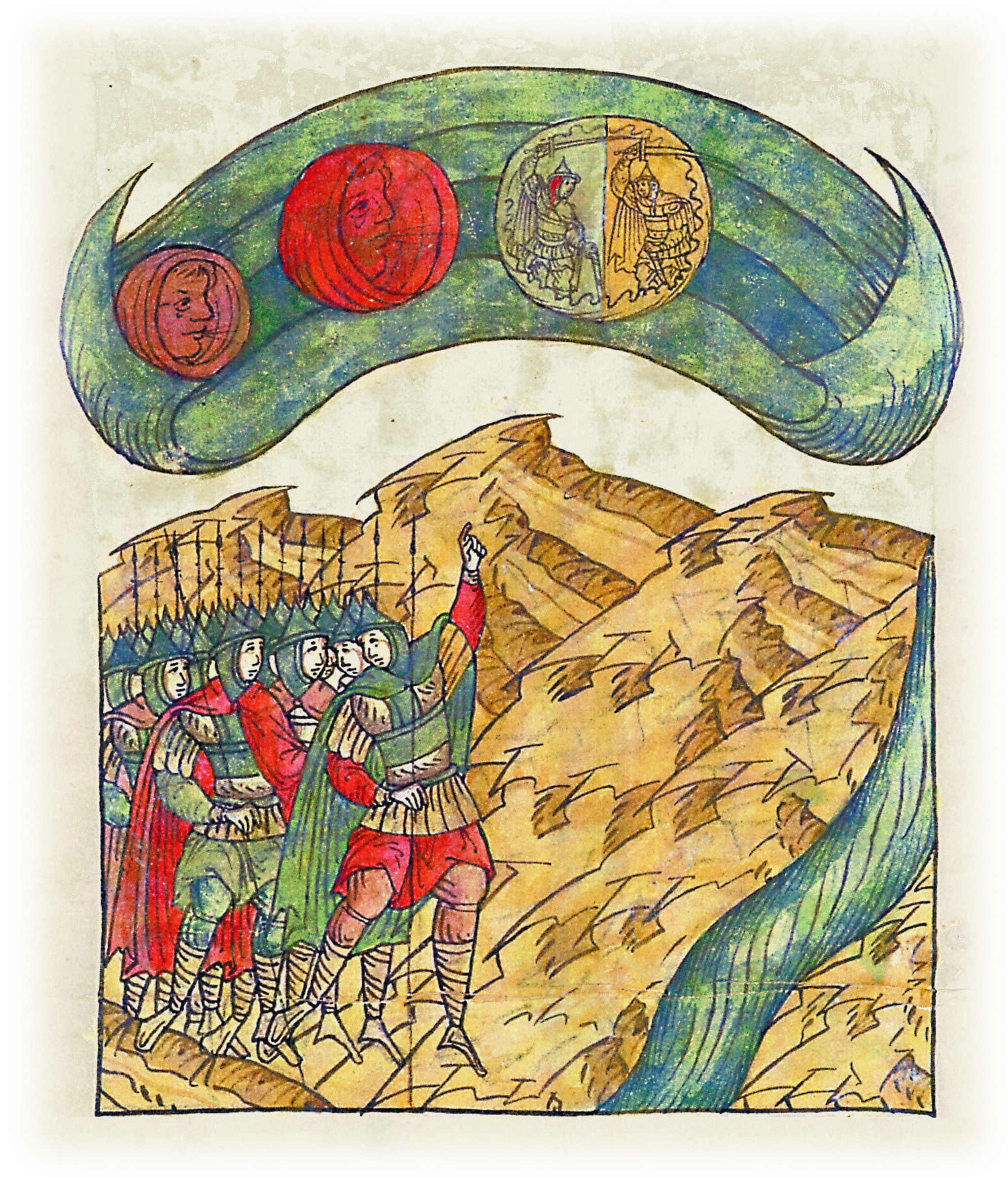 Тогда было знамение в луне страшное, ибо шла по небу изменяясь, и начала убывать понемногу, и стала как сукно красное, и потом как кровавое, а также словно два лица имела, одно – зеленое, а другое – желтое, посередине же ее словно двое ратных, секущихся мечами, у одного кровь из головы текла, а у другого – словно молоко.