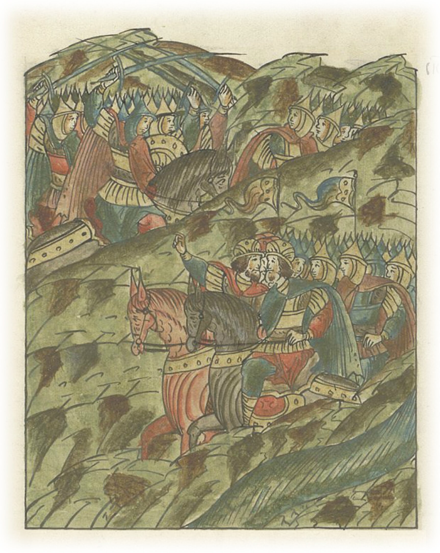Великий Киевский князь Мстислав Романович, его зять князь Андрей и князь Александр Дубровский, видя страшную битву, не сдвигаются с места и продолжают стоять над рекой Калкой.