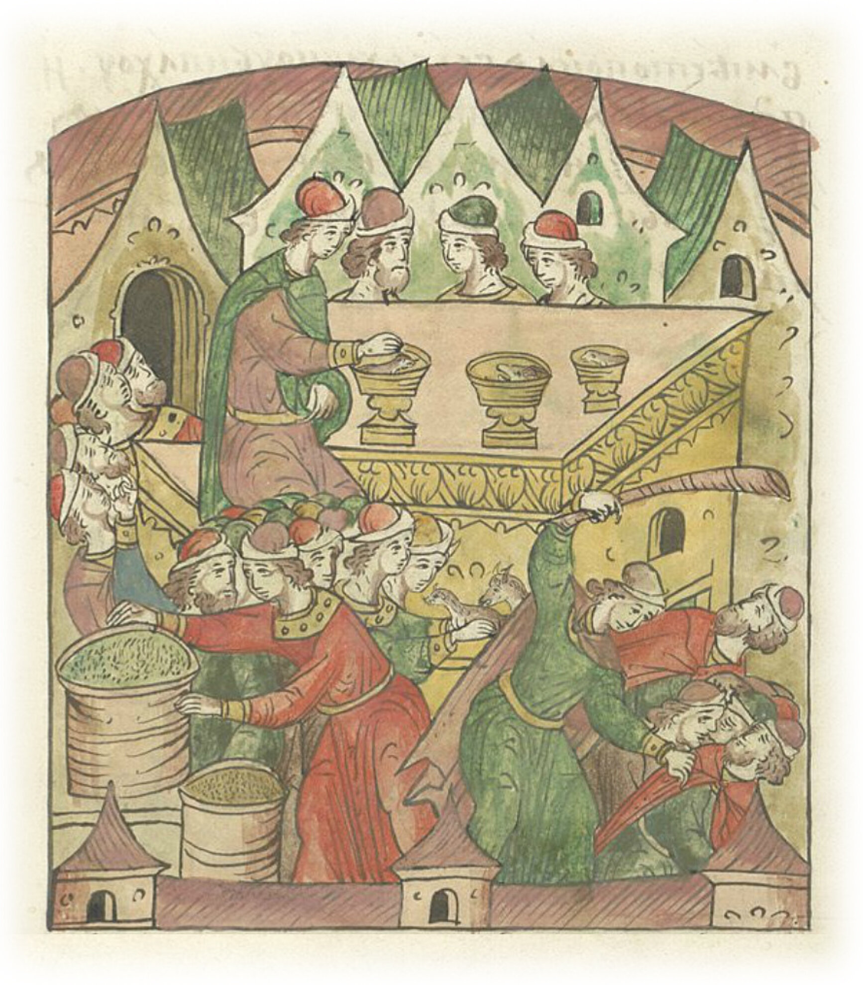 Голод же все больше распространялся, не только по всей земле, но и в Новгороде, кроме только одного Киева; таков был гнев Божий, что не только мертвых людей ели, но и живые люди друг друга убивали и ели, а еще конину, и собак, и кошек, и иное подобное - где кто что найдет, ели; иные же мох, и сосну, и вяз, и кору липовую, и лист ели. Злые же люди, если слышали где, что у кого-то есть зерно, с силою приходили в место то, грабили и убивали. И распространился гнев Божий, и померло людей по всей земле бесчисленно. Было же это два года, в седьмом и в восьмом (т.е. 6737 и 6738 / 1229 и 1230).
