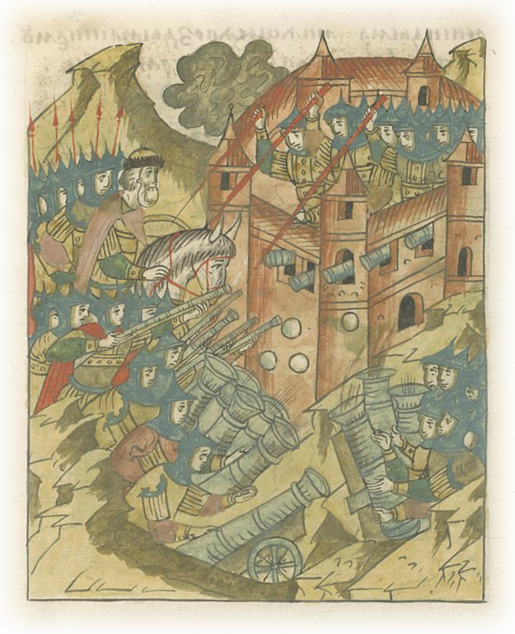 И, поставив большие пушки и пищали около города, повелел по городу бить со всех сторон, приступы великие делать без отдыха и огненными пушками по городу бить. И от пушечного и пищального грохота, от людского крика и воплей, а также от ответной пушечной и пищальной стрельбы городских людей земля колебалась так, что им друг друга не было видно, и весь город, (окутанный ) пламенем и клубами дыма, казалось, вздыбился. И страх великий напал на горожан.