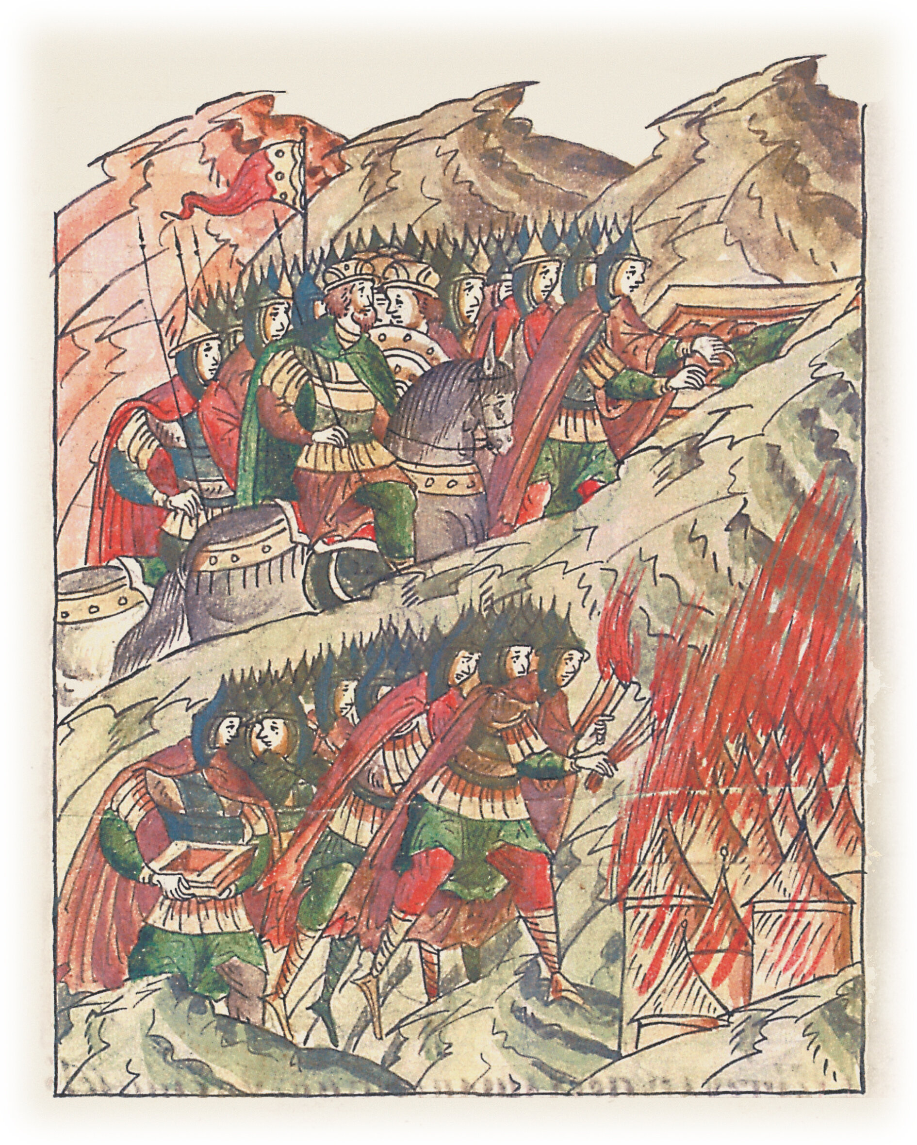 Князья Изяслав и Владимир Давыдовичи жгут и грабят село князя Игоря Олеговича.